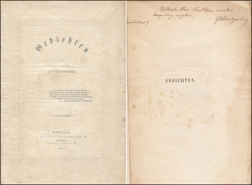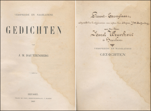 Op de titelpagina staat in het handschrift van Dautzenberg de opdracht: Weledelen Heer Van Vloten met aller hoogachting aangeboden JM Dautzenberg Careveldstraet 7.