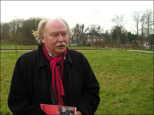 Manuel Kneepkens met rechts van hem op de achtergrond zijn ouderlijk huis in Terwinselen