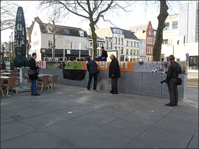 | Wethouder van Heerlen Barry Braeken onthult de muur met de gedichtenregel van Manuel Kneepkens... |
